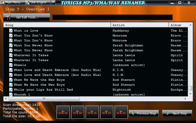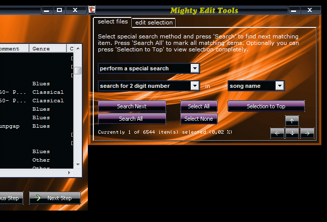 Here you see the Search ‘n’ Edit window that allows you to systematically seek and change data. That’s well usable for ‘copyrighting’ YOUR mp3/wma files before sharing, so that everyone in the Internet knows who you are.