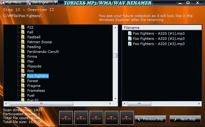 Before finally altering your mp3 files you have the opportunity to view and edit the result in the ‘Explorer-Preview’. Like in the Windows-Explorer you can change any file- and directory name. BUT NOTE: the Explorer won’t change the file’s TAG data together with the file name, Toricxs does! So when you change a file name then the TAG will automatically be assimilated.